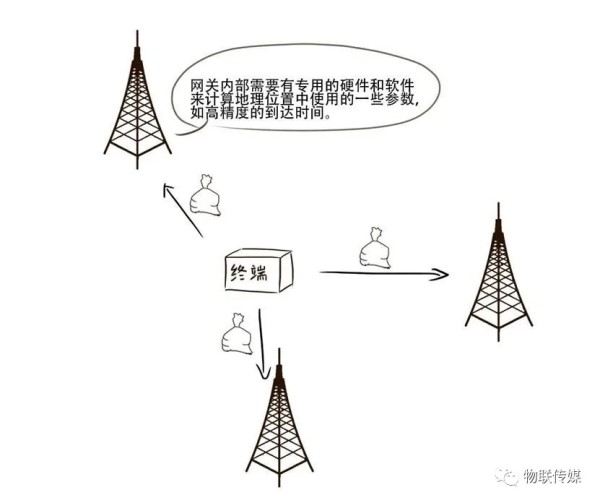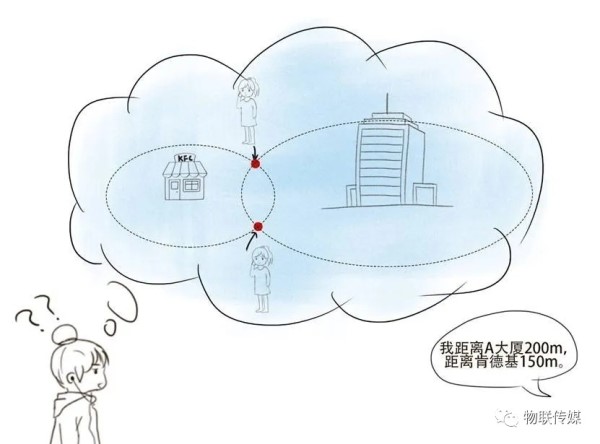 此时,如果把A大厦、肯德基和麦当劳这三个已知的地点换成是三个固定的网关,而你本人比作是一个移动的物联网终端的话,那么就可以理解为,通过三个网关是能够确定一个终端的位置,这也正是为什么实现地理位置功能至少需要三个网关接收数据包的原因所在。